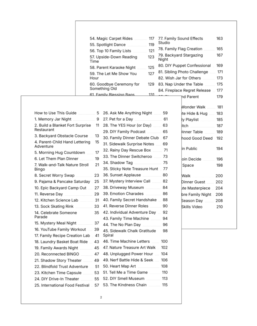 🧠 100 Tested Family Activities ($147 Value) — Real-life ideas with setup instructions, age adaptations, and connection insights